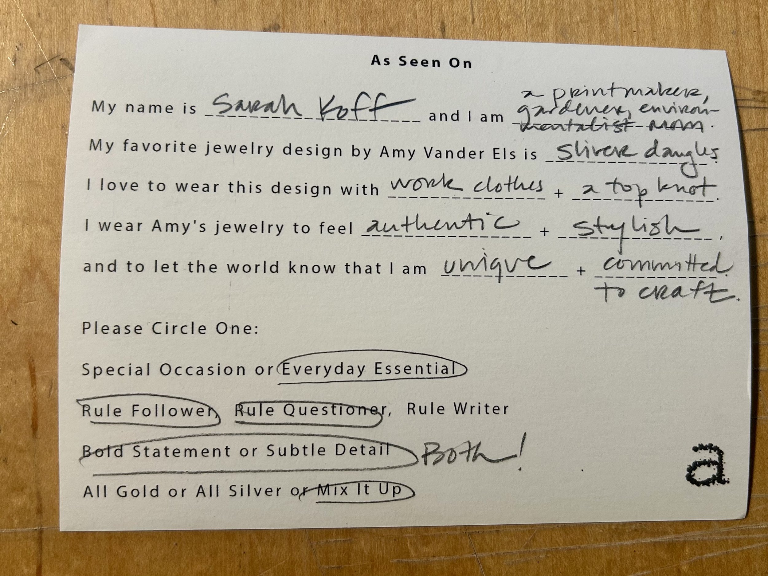 Jeans, a few layers of shirts covered by an overshirt. I get ink on everything so it can’t be too nice! Jewelry is the one “nice” element that I wear to feel pretty, polished, professional, and like I have a sense of style.